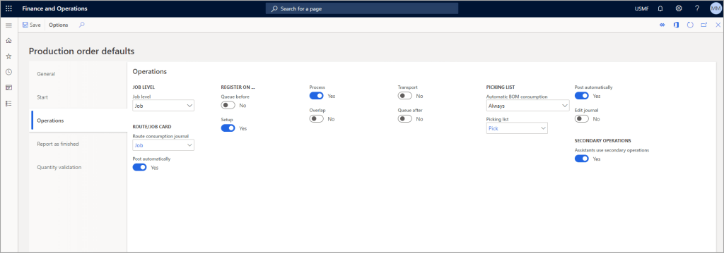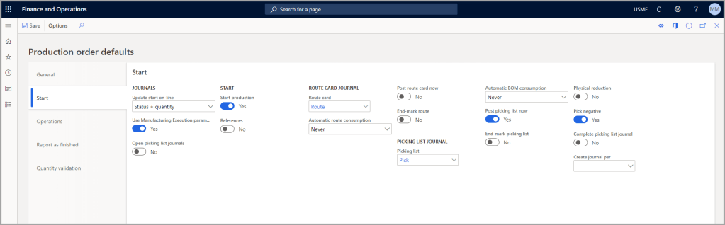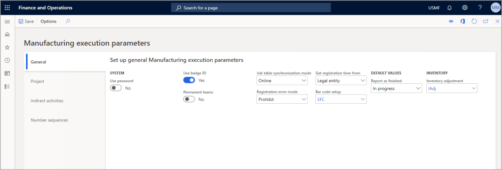 - Manufacturing execution parameters – Sets up manufacturing execution parameters in the Production control module.